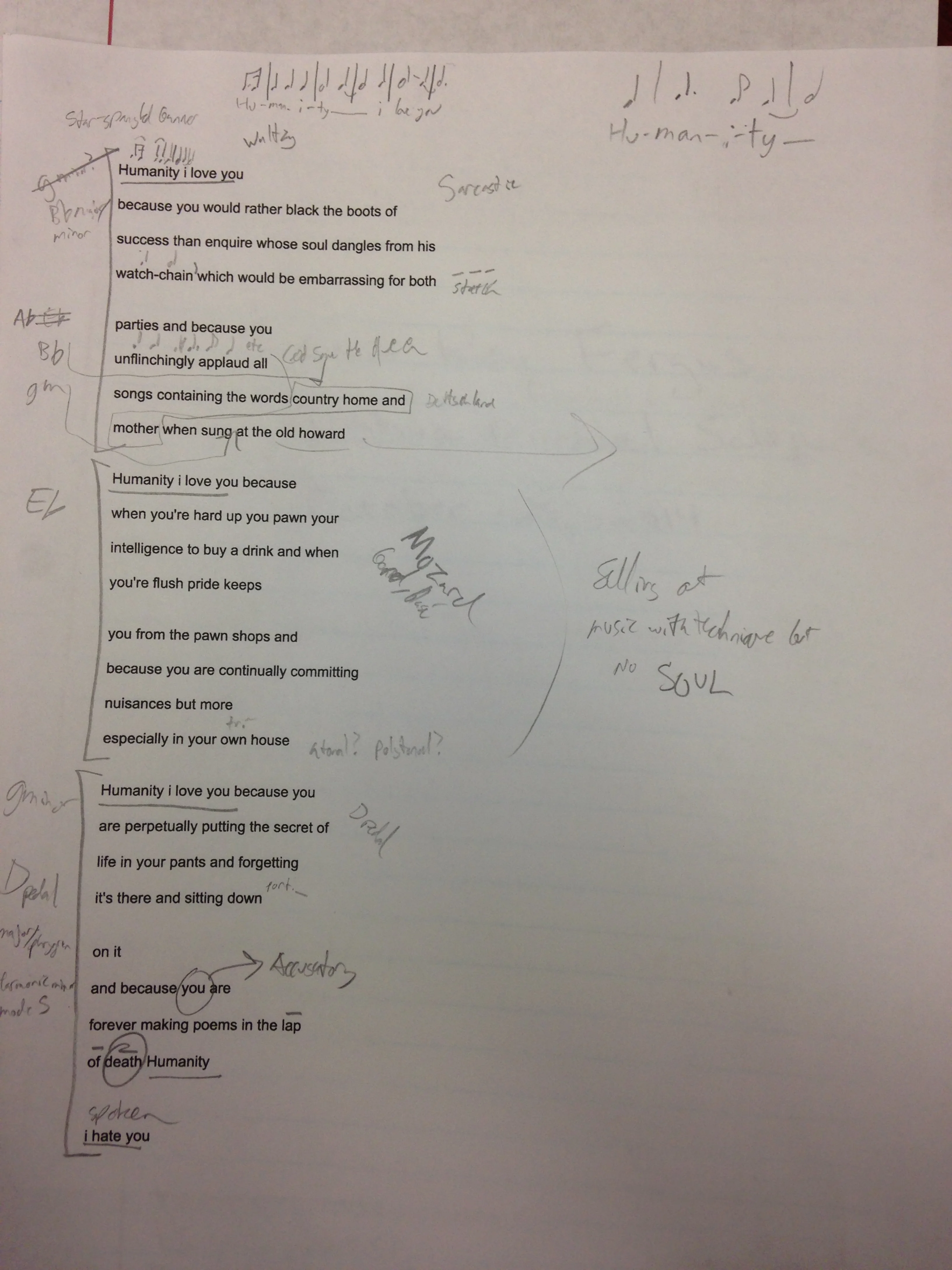 When I first started to write vocal music, almost ten years ago, everything happened all at once: pitches, rhythms, chords, structure, harmony, motives, all in one big jumble. As I've gotten a bit older and gotten a bit more focused, I've come up with a better order of events. As I mentioned above, the first "musical" step in the process is to sit down with the text and improvise, coming up with the general sketches of sounds that I want. I'm thinking a little about overall structure at this point, but far more about the aesthetic, how I want something to sound and feel.